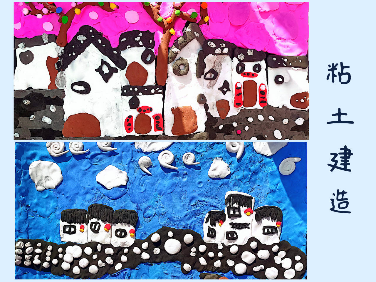 黏土组这边,则将中国传统建筑最重要的流派之一——徽式建筑与粘土版画相融合,通过无障碍互动,粘土在儿童和志愿者们的手中慢慢变成轻舟、果树……不一会儿,一幅幅《江南水景图》便跃然纸上。