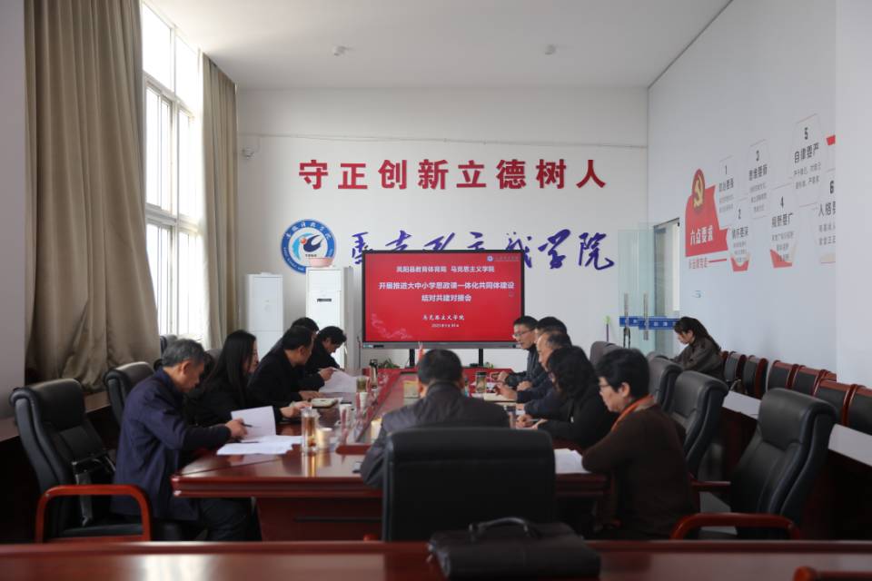 为深入贯彻落实党的二十大精神,全面推进大中小学思政教育一体化建设,充分发挥学校思政课立德树人关键课程作用,切实提升思政教育铸魂育人实效,3月30日上午,凤阳县委教体工委书记、教育体育局局长刘文春,教体工委副书记顾斌一行,来到博鱼官方网页版_博鱼(中国)马克思主义学院学术交流中心与我院开展推进大中小学思政课一体化共同体建设结对共建对接会。对接会由马克思主义学院党总支副书记、院长张德化主持,马克思主义学院党总支书记杨仕勇,副院长张栋等出席会议。