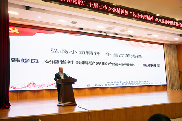 韩修良围绕“弘扬小岗精神 争当改革先锋”做主旨报告。他指出,全面深化改革迫切需要弘扬小岗精神,拿出更大的政治勇气和智慧,更有力的措施和办法;发展出题目,改革做文章,进一步全面深化改革要突出问题导向;中国特色社会主义制度是一个严密完整的科学制度体系,全面深化改革必须以制度建设为主线;深刻把握全面深化改革的牵引、出发点和落脚点;争当先锋要有明确的行动路径。