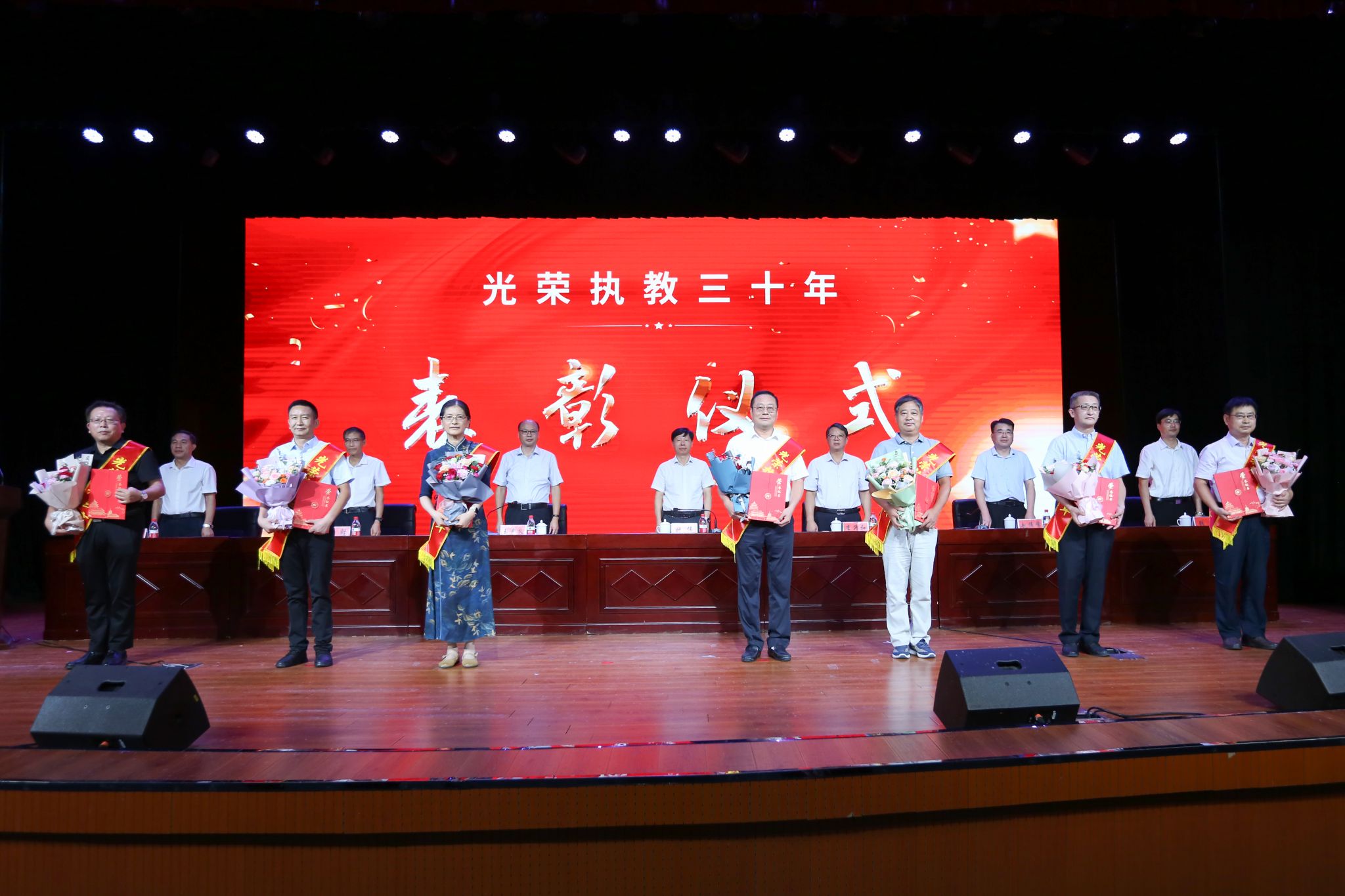 会上,李升和宣读了2023年以来学校在师德、教学、人才、科研、管理等方面获得省级及以上奖励人员名单。赵伟峰带领新进教师进行了入职宣誓。会议还向2023年以来退休教职工代表、获得“光荣执教三十年”荣誉称号的教师代表颁发了证书,新进教师代表向他们献花并合影留念。