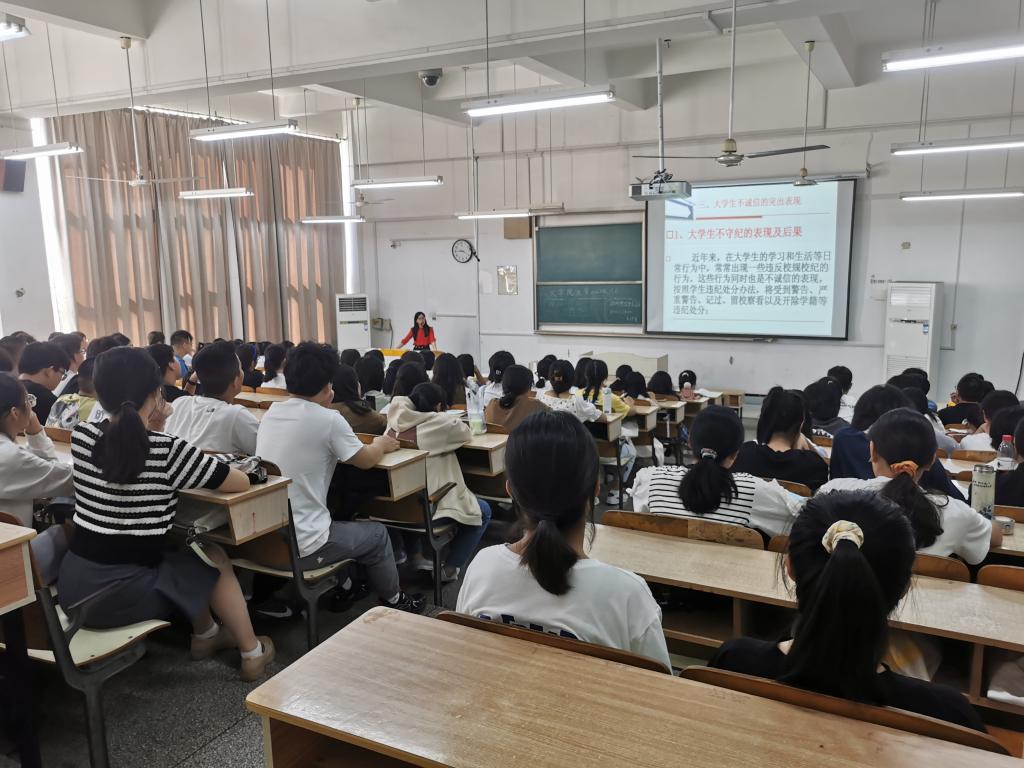 鲁冰冰讲述了诚信的含义与重要性,列举了少数大学生不守纪、不守法、不守信的突出表现及严重后果。她指出,大学生在生活方面应当遵规守纪、自尊自爱;在学习方面应当遵守课堂秩序,创建良好学风;在学术、资助、求职就业方面应该诚实守信。她带领全体新生学习了《博鱼官方网页版_博鱼(中国)学生日常行为规范》,讲述了大学生校园礼仪的重要性,在宿舍群体生活礼仪、校园课堂礼仪、师生交往礼仪、参加校园集体活动礼仪等方面提出了具体要求,认真回答了同学们就学习生活方面提出的具体问题,帮助新生更好的完成“大学生”身份的转变。