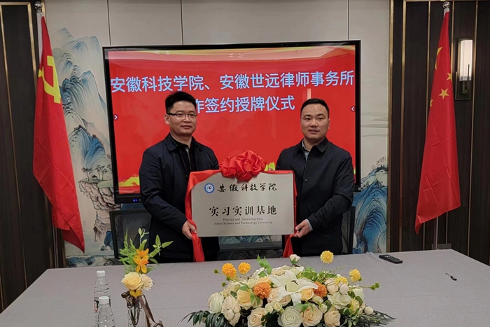 李晓东代表学院与安徽世远律师事务签署实习实训基地协议,牛永辉向安徽世远律师事务所授予“博鱼官方网页版_博鱼(中国)实习实训基地”牌匾。(特约通讯员:高晓宁 摄影:高晓宁 审核:牛永辉)