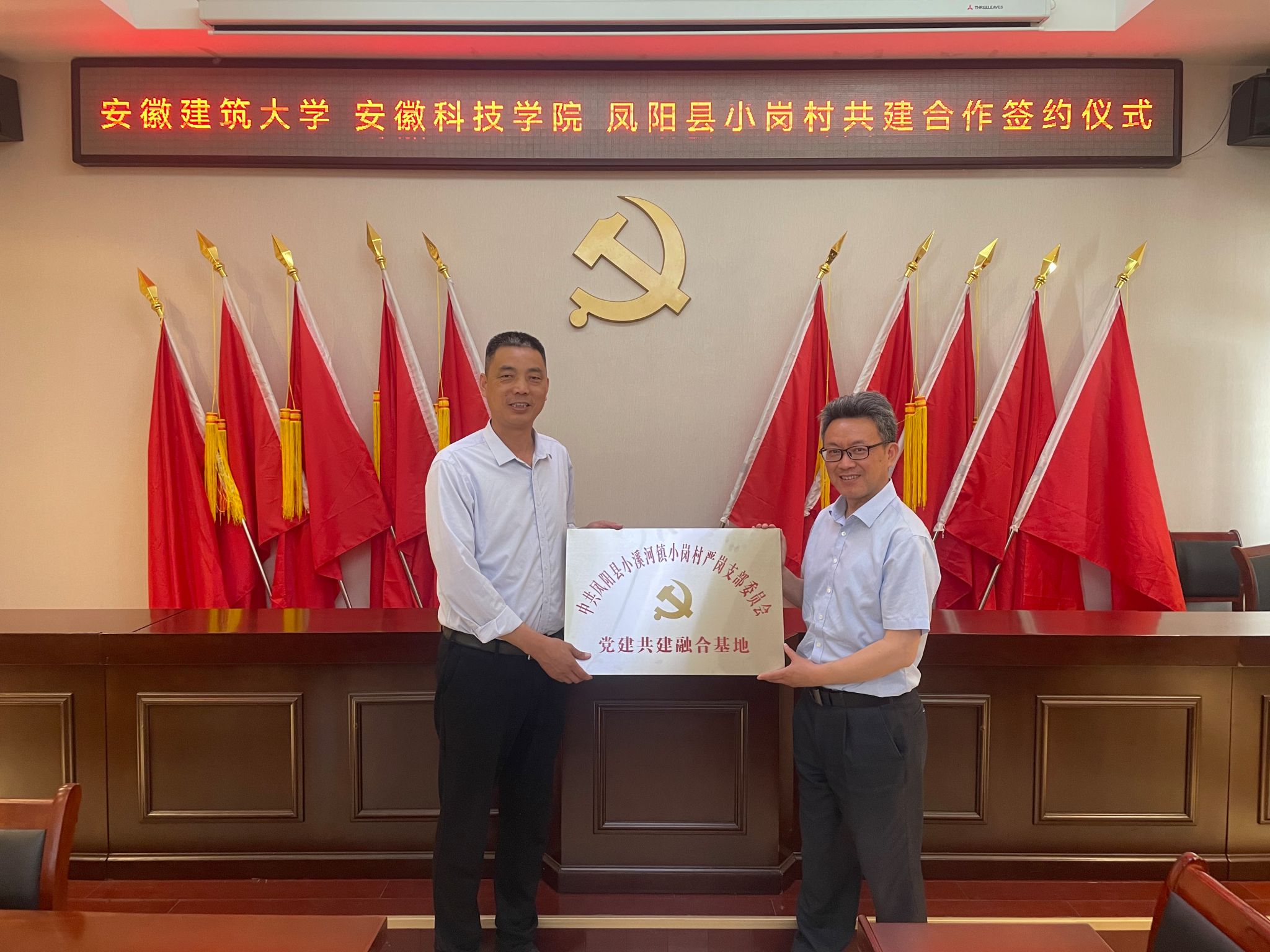 根据博鱼官方网页版_博鱼(中国)《关于进一步深化与凤阳县小岗村战略合作助力乡村振兴实施方案》和《2024年深化与凤阳县小岗村合作推动乡村治理重点工作安排》,为充分发挥人文学院党委“全省高校党建工作标杆院系”和全省高校“双带头人”教师党支部书记工作室的引领辐射作用,深化校地全面合作,助力小岗村基层党建提质增效与融合发展,在学校与凤阳县小岗村战略合作领导小组办公室(以下简称“校小岗合作办”)和党委组织部、宣传部的牵头协调和精心组织下,5月15日下午,人文学院党委携手安徽建筑大学公共管理学院党委,与小岗村严岗党支部联合开展结对共建,在小岗村党员活动室举行党建共建合作签约暨党建共建融合基地揭牌仪式。我校党委委员、校小岗合作办常务副主任、机关党委书记卫胜主持仪式,党的二十大代表、小岗村党委书记、村委会主任周群之,人文学院党委副书记、院长李晓东,安徽建筑大学公共管理学院党委委员、副院长连瑞瑞出席仪式并讲话。