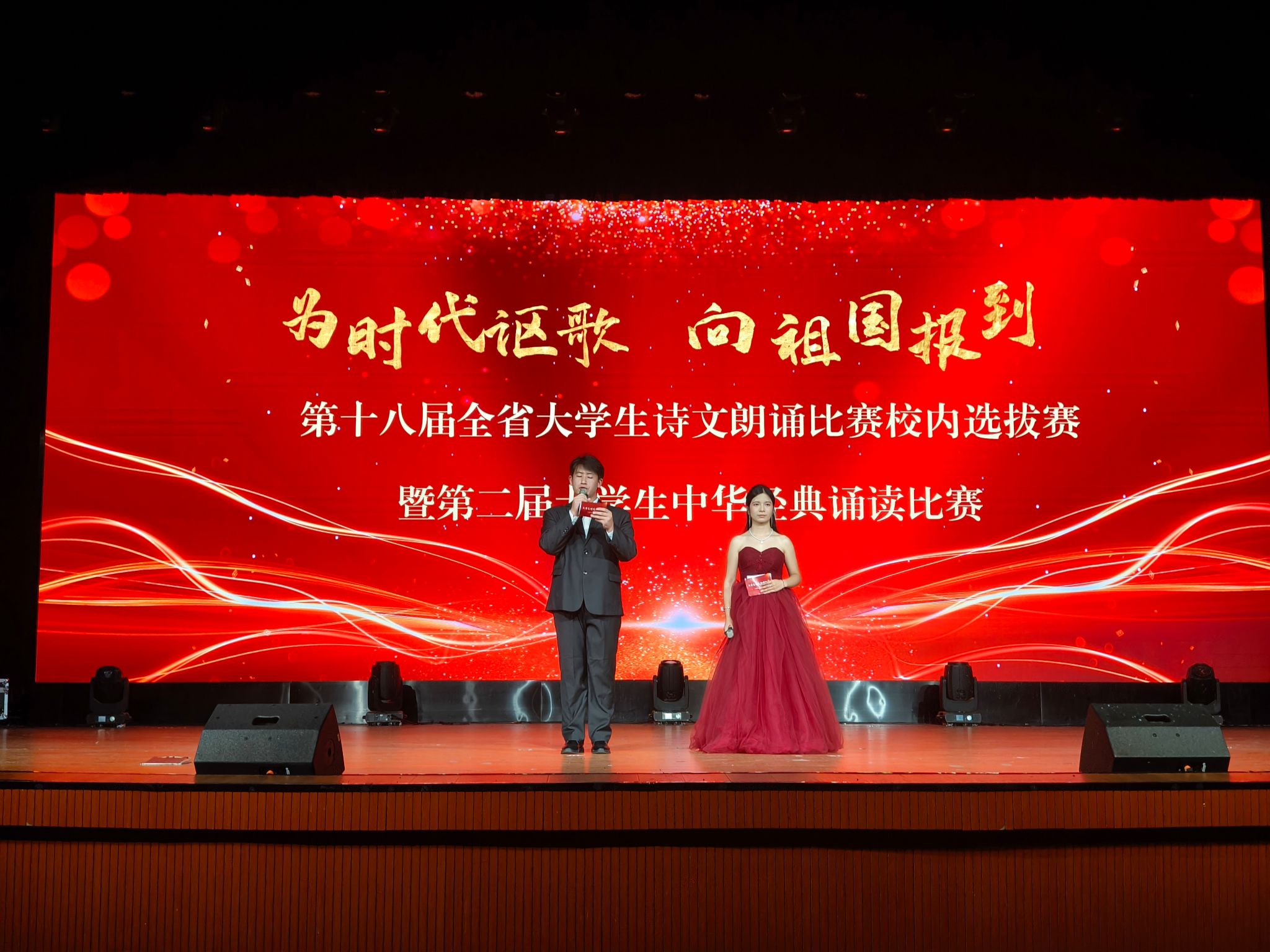 经各二级学院的选拔与推送,本次比赛共有十四组作品参赛。比赛现场,选手们以经典诗文作品进行朗诵再创作,通过刚劲有力的诵读、抑扬顿挫的声调、满怀激情的演绎,将字里行间的情感抒发得淋漓尽致,用声音传递中华文化的魅力,歌颂祖国的崭新篇章。