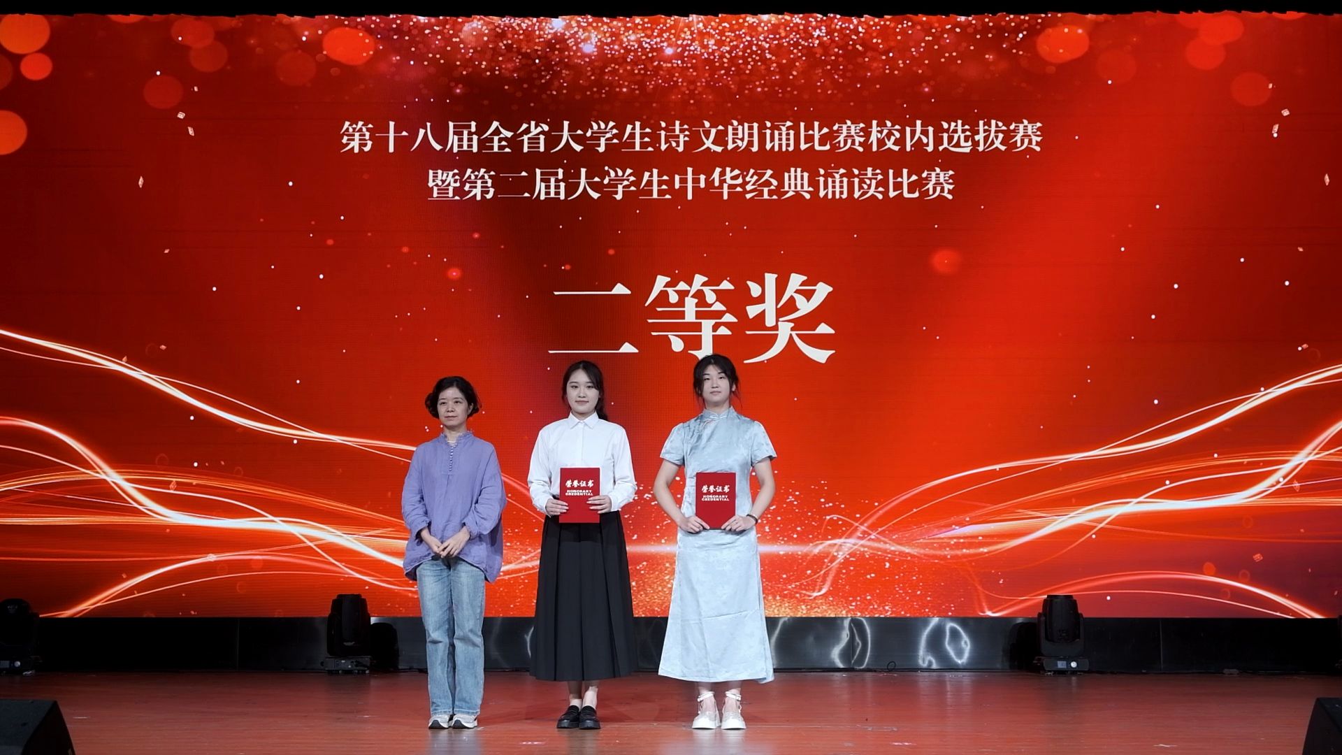 经过精彩的比拼角逐,《时间的入口》(朗诵者:王洋旭)斩获一等奖,《不朽》(朗诵者:李文文)、《我们的青春》(朗诵者:袁雪、唐静静)获得二等奖,《青春中国》(朗诵者:王浩)、《秋天里的中国》(朗诵者:黄勇诚)、《这是一张张怎样的脸》(朗诵者:张馨予)、《诗颂风华》(朗诵者:李子燕、鄢德强、郭甜)获得三等奖。