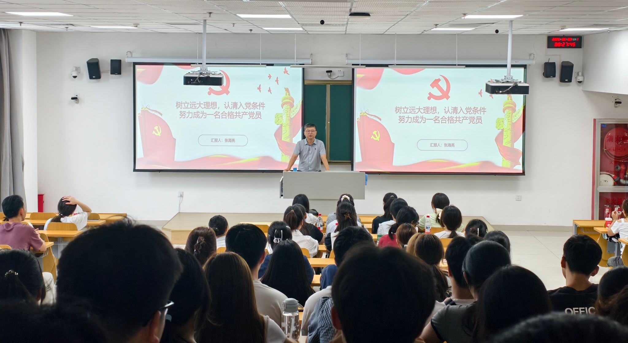 张海亮从学习党的历史、认识入党条件、履行义务权利、了解入党程序四个方面展开系统阐述,引导新生坚定理想信念,勉励他们积极向党组织靠拢。张海亮强调大学生应主动规划政治追求,将个人成长与国家发展紧密结合,将时代使命融入学业实践。