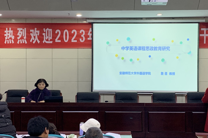 安徽师范大学外国语学院詹蓓教授应邀做题为《中学英语学科课程思政教育研究》的专题讲座。讲座主要探讨了初中英语教学融合课程思政的重要性、方法和路径,以及如何将育人育才的目标充分融合到初中英语教学的各个环节。