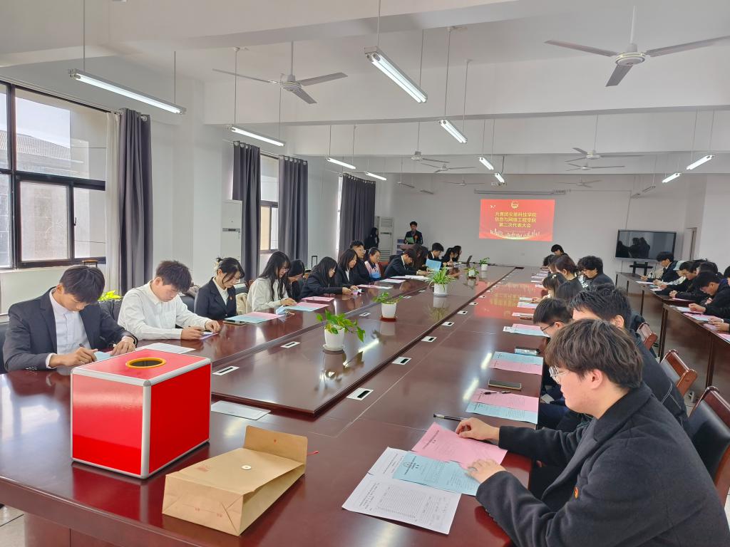 在圆满完成各项任务后,大会在激昂的团歌中顺利闭幕。随后,信息与网络工程学院召开团委二届一次会议选举产生团委书记、副书记。