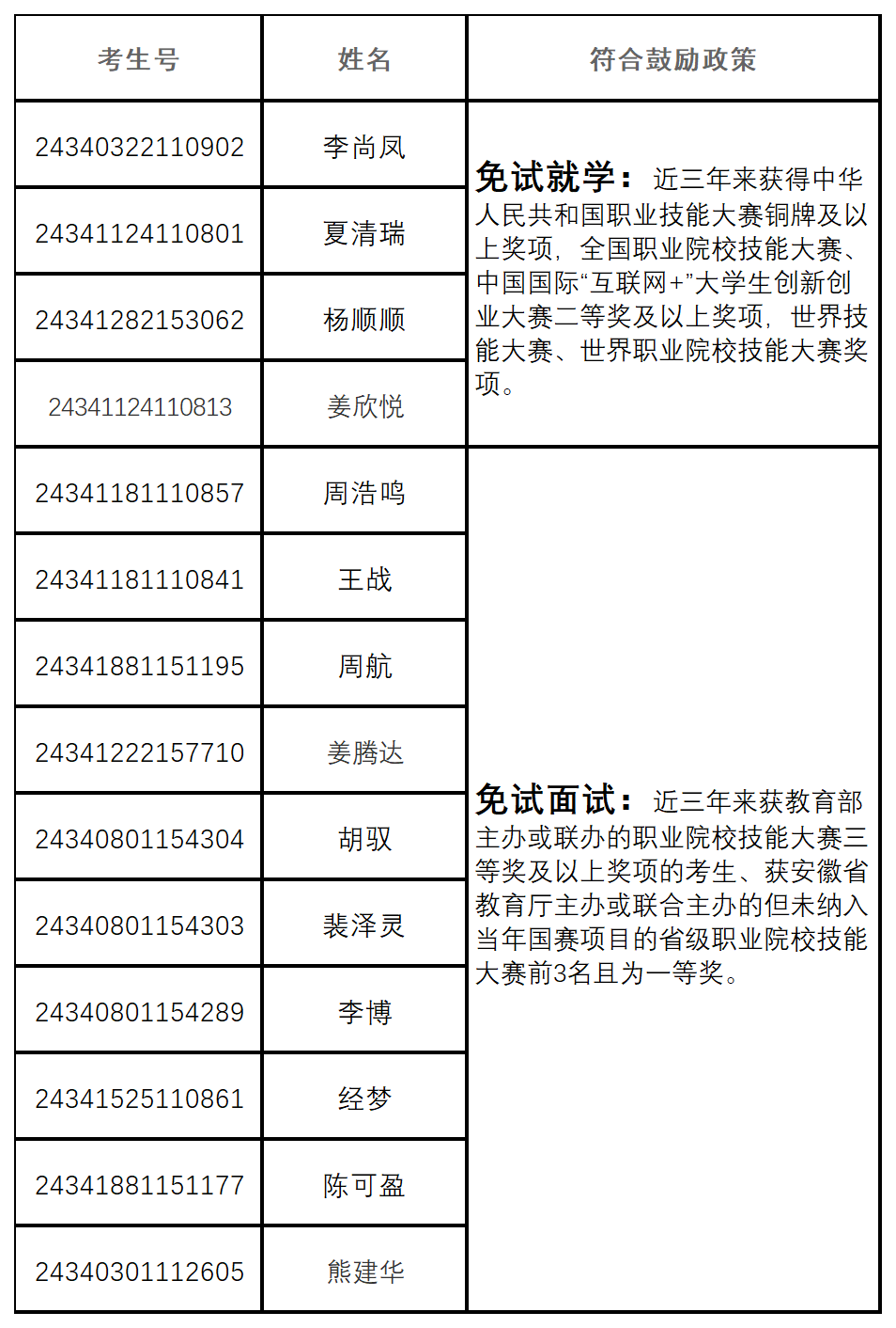 根据《博鱼官方网页版_博鱼(中国)2024年面向中职毕业生对口招生章程》关于申请免试就学、免试面试和加分鼓励政策的相关要求,经考生申请,学校审核,共有李尚凤等4名考生符合免试就学政策,周浩鸣等10名考生符合技能大赛免试面试政策,无符合考试加分政策考生,现对符合相关鼓励政策的考生信息予以公布。免试就学资格复审和免试面试具体安排见通知公告栏“博鱼官方网页版_博鱼(中国)2024年对口招生考试免试就学资格复审和免试面试工作通知”。如有异议或遗漏,请于4月3日17:00前联系博鱼官方网页版_博鱼(中国)招生办公室:0550-6732041,0552-3197041。